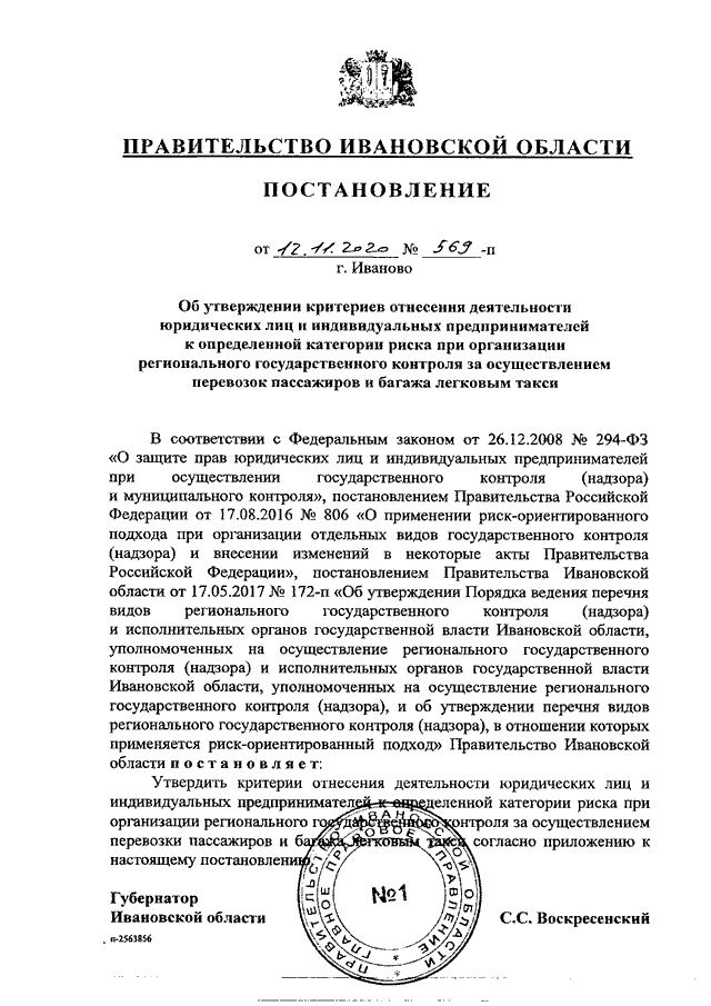 Постановление Правительства Ивановской области от 12.11.2020 N 569-п "Об утверждении критериев отнесения деятельности юридических лиц и индивидуальных предпринимателей к определенной категории риска при организации регионального государственного контроля за осуществлением перевозок пассажиров и багажа легковым такси"
