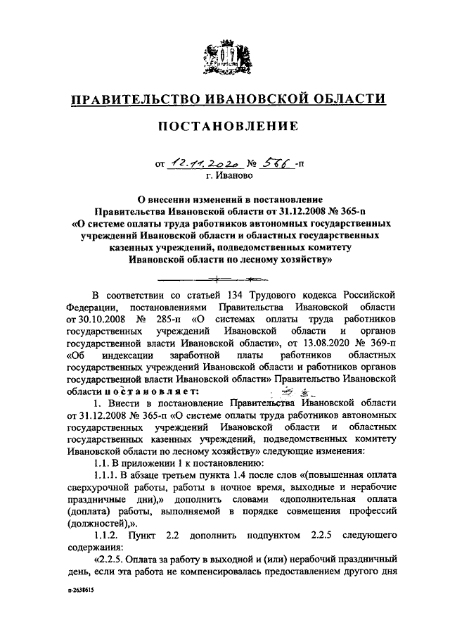 Постановление Правительства Ивановской области от 12.11.2020 N 566-п "О внесении изменений в постановление Правительства Ивановской области от 31.12.2008 N 365-п "О системе оплаты труда работников автономных государственных учреждений Ивановской области и областных государственных казенных учреждений, подведомственных комитету Ивановской области по лесному хозяйству"