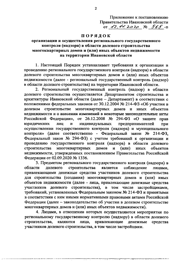 Постановление Правительства Ивановской области от 12.11.2020 N 565-п "Об утверждении Порядка организации и осуществления регионального государственного контроля (надзора) в области долевого строительства многоквартирных домов и (или) иных объектов недвижимости на территории Ивановской области"