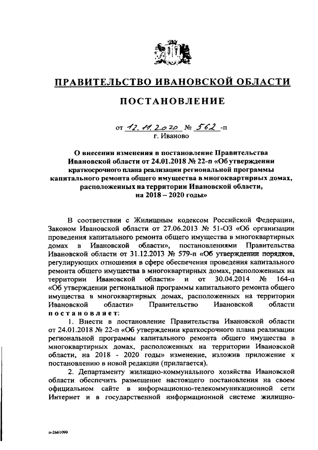 Постановление Правительства Ивановской области от 12.11.2020 N 562-п "О внесении изменения в постановление Правительства Ивановской области от 24.01.2018 N 22-п "Об утверждении краткосрочного плана реализации региональной программы капитального ремонта общего имущества в многоквартирных домах, расположенных на территории Ивановской области, на 2018 - 2020 годы"
