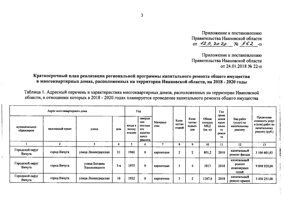 Постановление Правительства Ивановской области от 12.11.2020 N 562-п "О внесении изменения в постановление Правительства Ивановской области от 24.01.2018 N 22-п "Об утверждении краткосрочного плана реализации региональной программы капитального ремонта общего имущества в многоквартирных домах, расположенных на территории Ивановской области, на 2018 - 2020 годы"