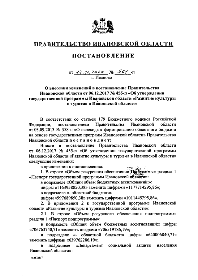 Постановление Правительства Ивановской области от 12.11.2020 N 561-п "О внесении изменений в постановление Правительства Ивановской области от 06.12.2017 N 455-п "Об утверждении государственной программы Ивановской области "Развитие культуры и туризма в Ивановской области"