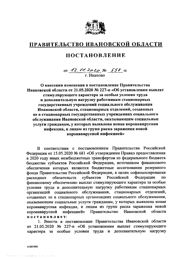 Постановление Правительства Ивановской области от 12.11.2020 N 558-п "О внесении изменения в постановление Правительства Ивановской области от 21.05.2020 N 227-п "Об установлении выплат стимулирующего характера за особые условия труда и дополнительную нагрузку работникам стационарных государственных учреждений социального обслуживания Ивановской области, стационарных отделений, созданных не в стационарных государственных учреждениях социального обслуживания Ивановской области, оказывающим социальные услуги гражданам, у которых выявлена новая коронавирусная инфекция, и лицам из групп риска заражения новой коронавирусной инфекцией"