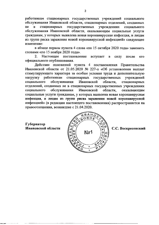 Постановление Правительства Ивановской области от 12.11.2020 N 558-п "О внесении изменения в постановление Правительства Ивановской области от 21.05.2020 N 227-п "Об установлении выплат стимулирующего характера за особые условия труда и дополнительную нагрузку работникам стационарных государственных учреждений социального обслуживания Ивановской области, стационарных отделений, созданных не в стационарных государственных учреждениях социального обслуживания Ивановской области, оказывающим социальные услуги гражданам, у которых выявлена новая коронавирусная инфекция, и лицам из групп риска заражения новой коронавирусной инфекцией"