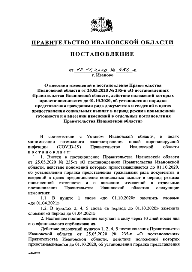 Постановление Правительства Ивановской области от 12.11.2020 N 556-п "О внесении изменений в постановление Правительства Ивановской области от 25.05.2020 N 235-п "О постановлениях Правительства Ивановской области, действие положений которых приостанавливается до 01.10.2020, об установлении порядка представления гражданами ряда документов и сведений в целях предоставления социальных выплат в период режима повышенной готовности и о внесении изменений в отдельные постановления Правительства Ивановской области"