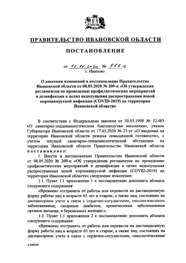 Постановление Правительства Ивановской области от 12.11.2020 N 555-п "О внесении изменений в постановление Правительства Ивановской области от 08.05.2020 N 209-п "Об утверждении регламентов по проведению профилактических мероприятий и дезинфекции в целях недопущения распространения новой коронавирусной инфекции (COVID-2019) на территории Ивановской области"