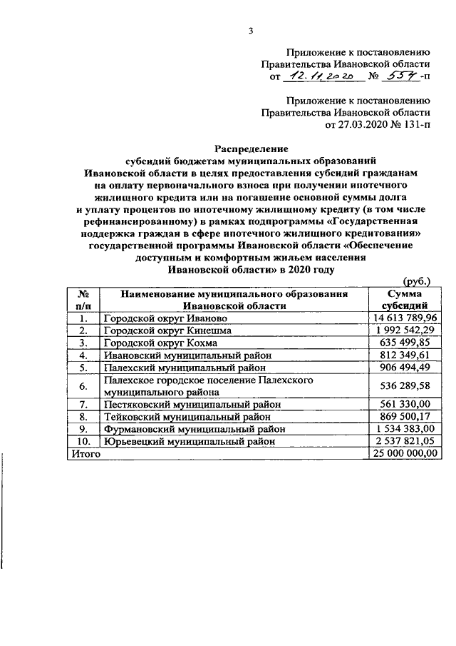 Постановление Правительства Ивановской области от 12.11.2020 N 554-п "О внесении изменения в постановление Правительства Ивановской области от 27.03.2020 N 131-п "О распределении субсидий бюджетам муниципальных образований Ивановской области в целях предоставления субсидий гражданам на оплату первоначального взноса при получении ипотечного жилищного кредита или на погашение основной суммы долга и уплату процентов по ипотечному жилищному кредиту (в том числе рефинансированному) в рамках подпрограммы "Государственная поддержка граждан в сфере ипотечного жилищного кредитования" государственной программы Ивановской области "Обеспечение доступным и комфортным жильем населения Ивановской области" в 2020 году"