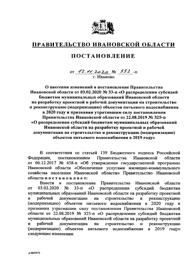 Постановление Правительства Ивановской области от 12.11.2020 N 552-п "О внесении изменений в постановление Правительства Ивановской области от 03.02.2020 N 33-п "О распределении субсидий бюджетам муниципальных образований Ивановской области на разработку проектной и рабочей документации на строительство и реконструкцию (модернизацию) объектов питьевого водоснабжения в 2020 году и признании утратившим силу постановления Правительства Ивановской области от 22.08.2019 N 325-п "О распределении субсидий бюджетам муниципальных образований Ивановской области на разработку проектной и рабочей документации на строительство и реконструкцию (модернизацию) объектов питьевого водоснабжения в 2019 году"