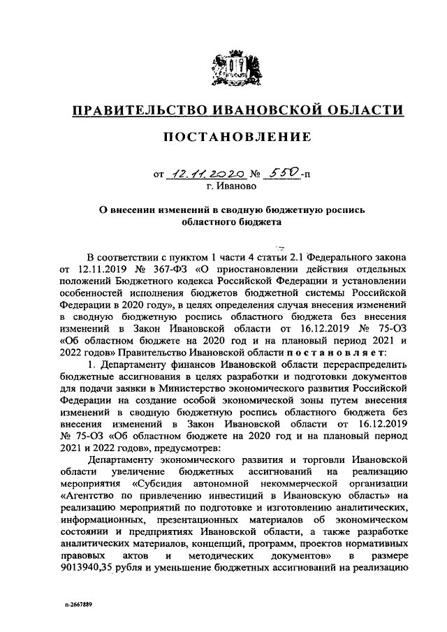 Постановление Правительства Ивановской области от 12.11.2020 N 550-п "О внесении изменений в сводную бюджетную роспись областного бюджета"