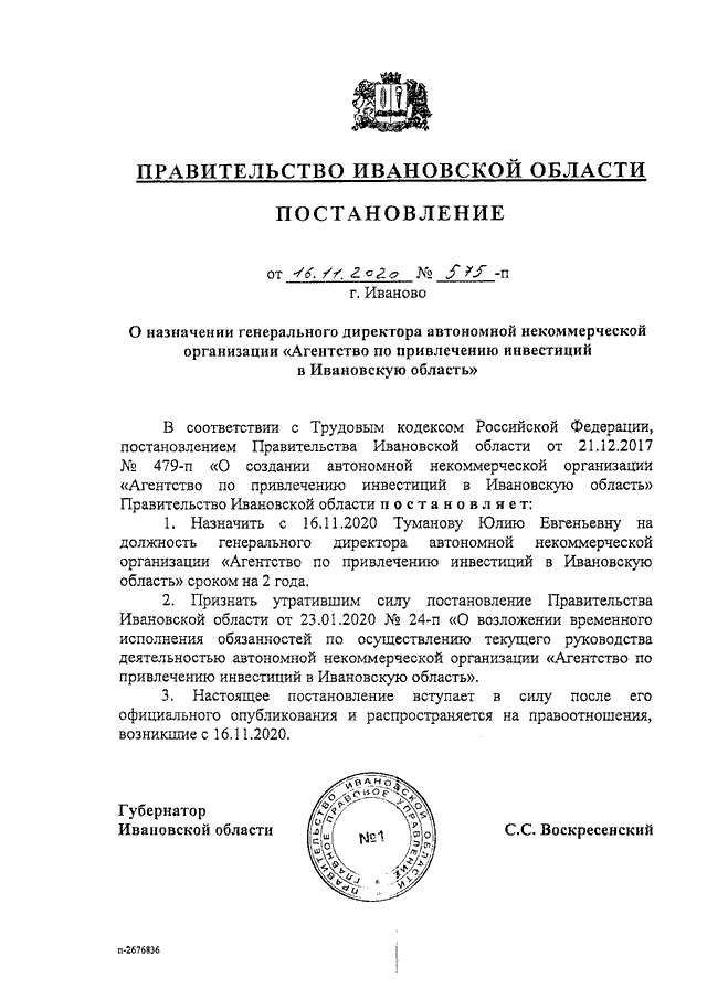 Постановление Правительства Ивановской области от 16.11.2020 N 575-п "О назначении генерального директора автономной некоммерческой организации "Агентство по привлечению инвестиций в Ивановскую область"