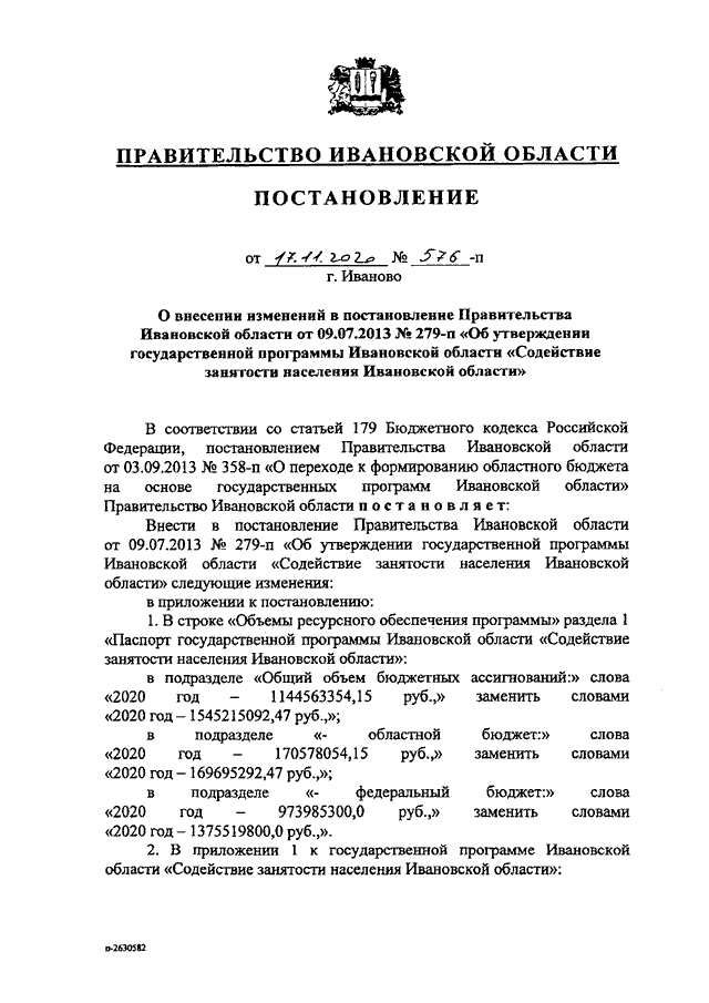 Постановление Правительства Ивановской области от 17.11.2020 N 576-п "О внесении изменений в постановление Правительства Ивановской области от 09.07.2013 N 279-п "Об утверждении государственной программы Ивановской области "Содействие занятости населения Ивановской области"