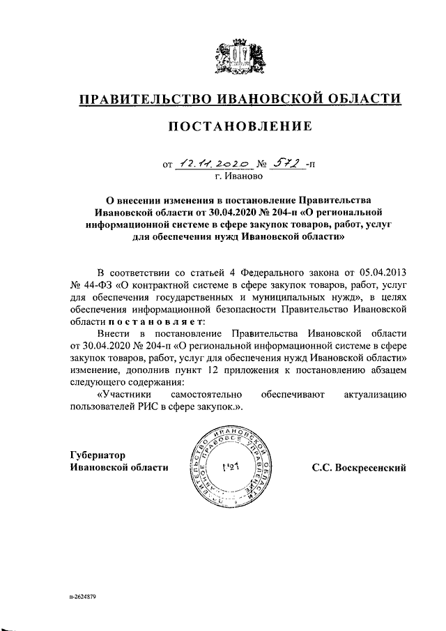 Постановление Правительства Ивановской области от 12.11.2020 N 572-п "О внесении изменения в постановление Правительства Ивановской области от 30.04.2020 N 204-п "О региональной информационной системе в сфере закупок товаров, работ, услуг для обеспечения нужд Ивановской области"