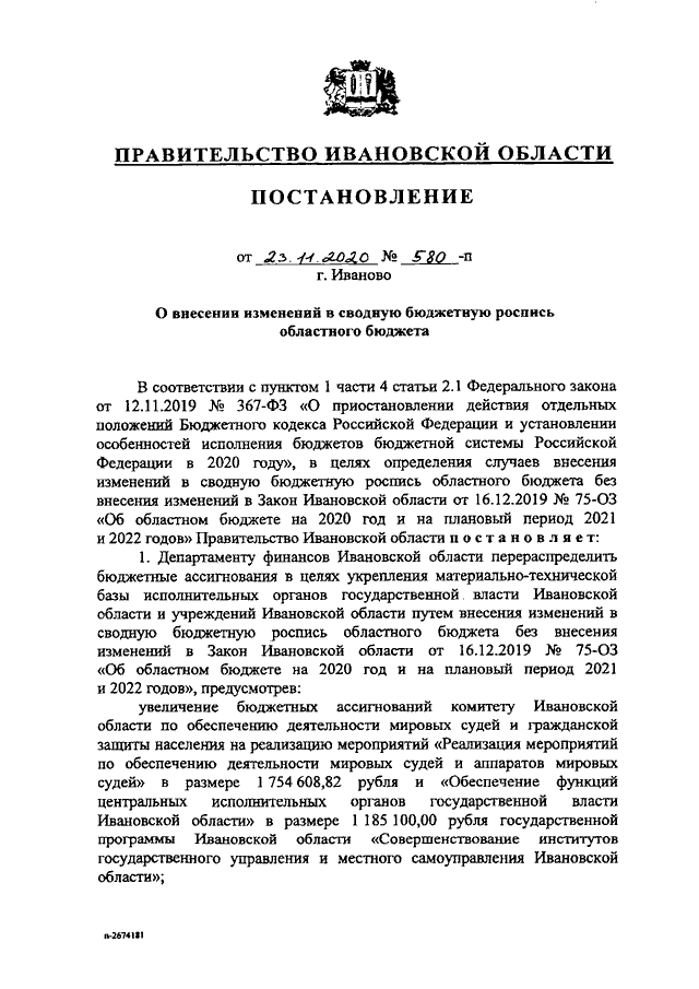 Постановление Правительства Ивановской области от 23.11.2020 N 580-п "О внесении изменений в сводную бюджетную роспись областного бюджета"