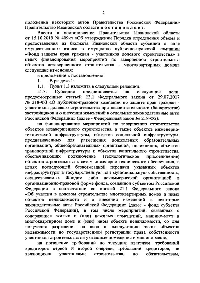 Постановление Правительства Ивановской области от 23.11.2020 N 579-п "О внесении изменений в постановление Правительства Ивановской области от 15.10.2019 N 409-п "Об утверждении Порядка определения объема и предоставления из бюджета Ивановской области субсидии в виде имущественного взноса в имущество публично-правовой компании "Фонд защиты прав граждан - участников долевого строительства" в целях финансирования мероприятий по завершению строительства объектов незавершенного строительства - многоквартирных домов"