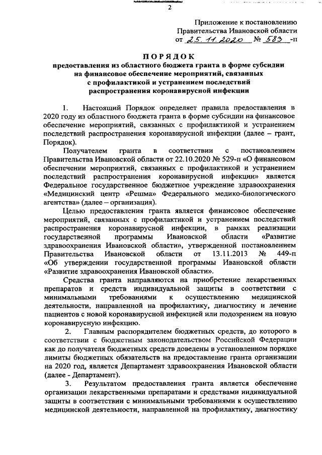 Постановление Правительства Ивановской области от 25.11.2020 N 583-п "Об утверждении Порядка предоставления из областного бюджета гранта в форме субсидии на финансовое обеспечение мероприятий, связанных с профилактикой и устранением последствий распространения коронавирусной инфекции"