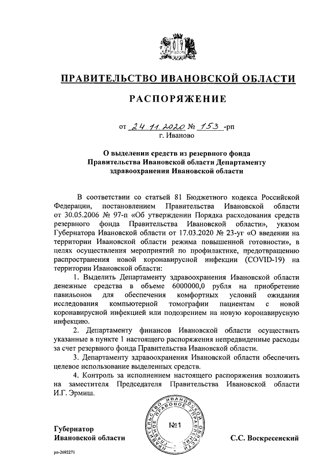 Распоряжение Правительства Ивановской области от 24.11.2020 N 153-рп "О выделении средств из резервного фонда Правительства Ивановской области Департаменту здравоохранения Ивановской области"