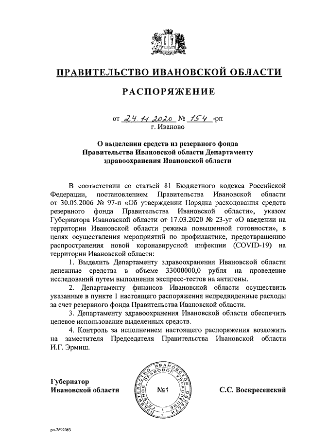 Распоряжение Правительства Ивановской области от 24.11.2020 N 154-рп "О выделении средств из резервного фонда Правительства Ивановской области Департаменту здравоохранения Ивановской области"