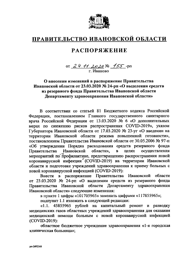 Распоряжение Правительства Ивановской области от 24.11.2020 N 155-рп "О внесении изменений в распоряжение Правительства Ивановской области от 23.03.2020 N 24-рп "О выделении средств из резервного фонда Правительства Ивановской области Департаменту здравоохранения Ивановской области"