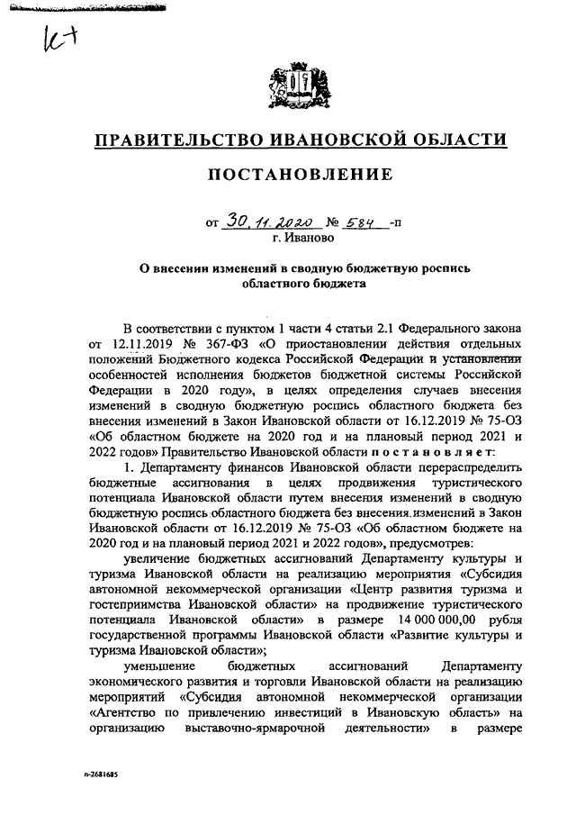 Постановление Правительства Ивановской области от 30.11.2020 N 584-п "О внесении изменений в сводную бюджетную роспись областного бюджета"
