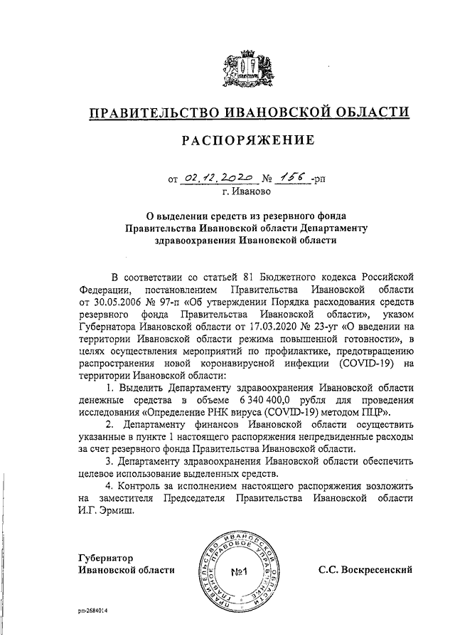Распоряжение Правительства Ивановской области от 02.12.2020 N 156-рп "О выделении средств из резервного фонда Правительства Ивановской области Департаменту здравоохранения Ивановской области"