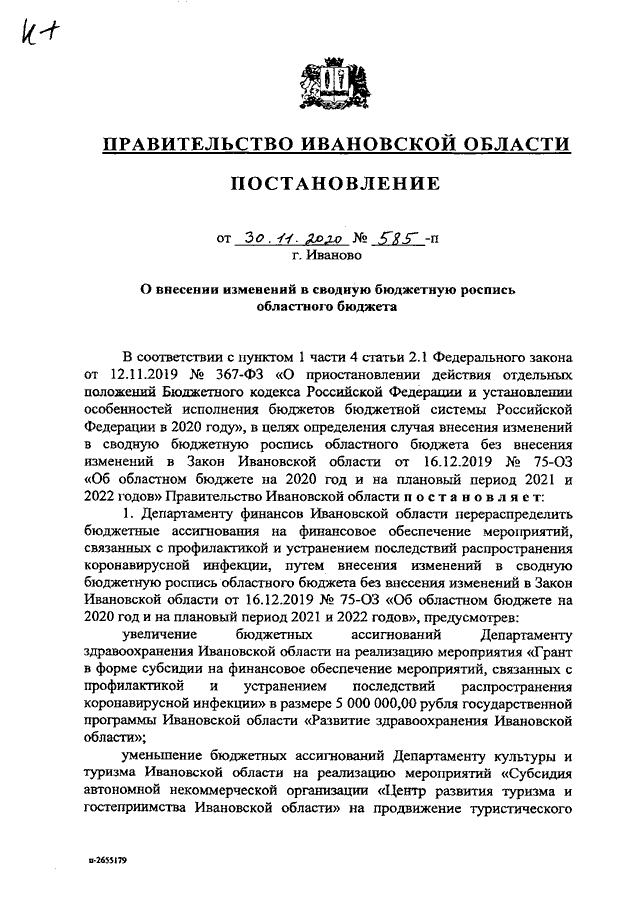 Постановление Правительства Ивановской области от 30.11.2020 N 585-п "О внесении изменений в сводную бюджетную роспись областного бюджета"