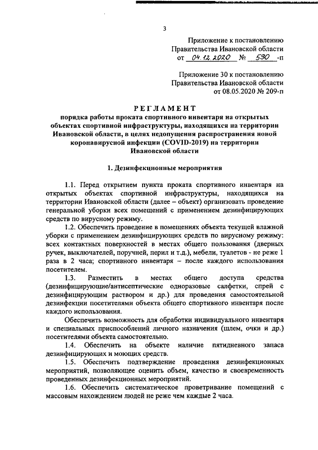 Постановление Правительства Ивановской области от 04.12.2020 N 590-п "О внесении изменений в постановление Правительства Ивановской области от 08.05.2020 N 209-п "Об утверждении регламентов по проведению профилактических мероприятий и дезинфекции в целях недопущения распространения новой коронавирусной инфекции (COVID-2019) на территории Ивановской области" (вместе с "Регламентом порядка работы проката спортивного инвентаря на открытых объектах спортивной инфраструктуры, находящихся на территории Ивановской области, в целях недопущения распространения новой коронавирусной инфекции (COVID-2019) на территории Ивановской области")