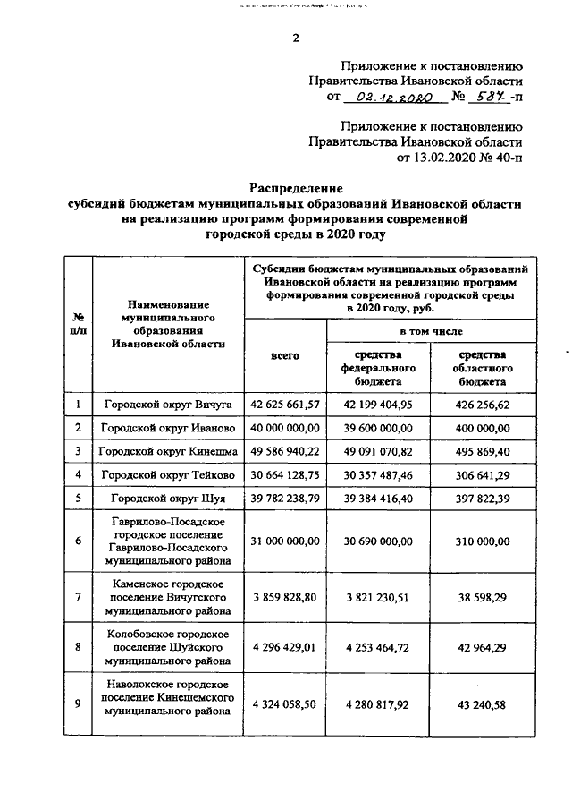 Постановление Правительства Ивановской области от 02.12.2020 N 587-п "О внесении изменения в постановление Правительства Ивановской области от 13.02.2020 N 40-п "О распределении субсидий бюджетам муниципальных образований Ивановской области на реализацию программ формирования современной городской среды в 2020 году"