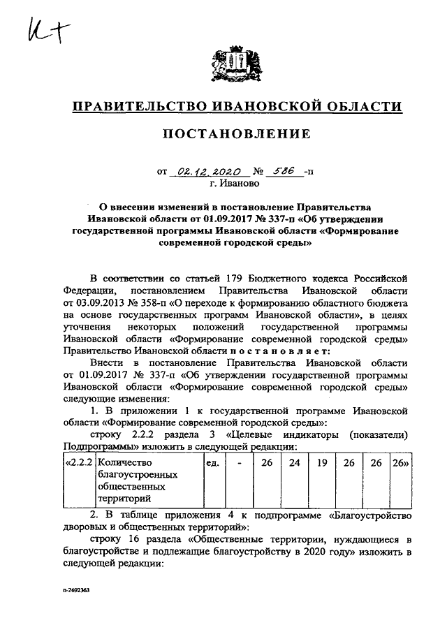 Постановление Правительства Ивановской области от 02.12.2020 N 586-п "О внесении изменений в постановление Правительства Ивановской области от 01.09.2017 N 337-п "Об утверждении государственной программы Ивановской области "Формирование современной городской среды"