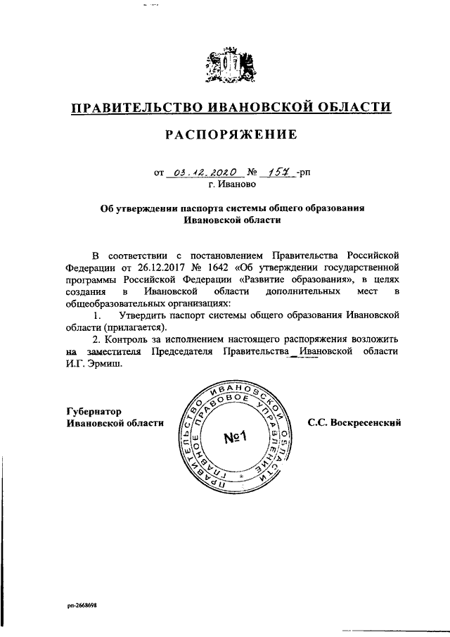 Распоряжение Правительства Ивановской области от 03.12.2020 N 157-рп "Об утверждении паспорта системы общего образования Ивановской области"