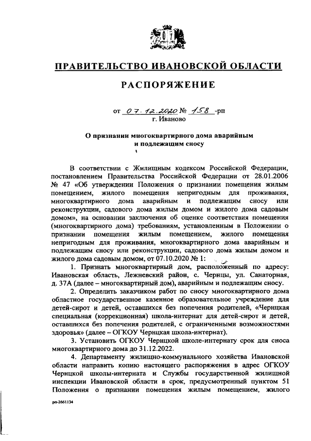 Распоряжение Правительства Ивановской области от 07.12.2020 N 158-рп "О признании многоквартирного дома аварийным и подлежащим сносу"