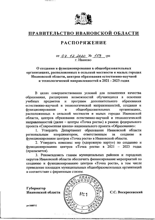Распоряжение Правительства Ивановской области от 07.12.2020 N 159-рп "О создании и функционировании в общеобразовательных организациях, расположенных в сельской местности и малых городах Ивановской области, центров образования естественно-научной и технологической направленностей в 2021 - 2023 годах"