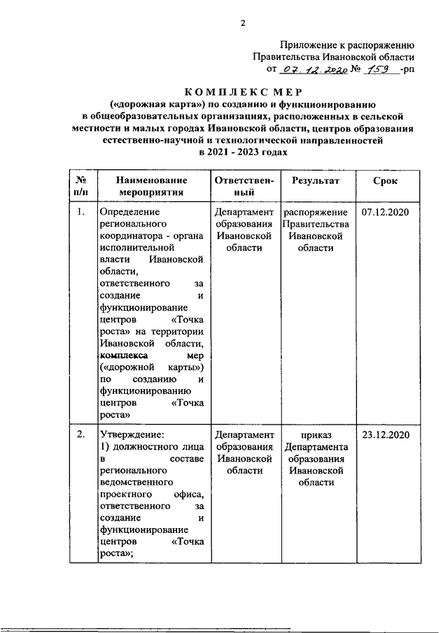 Распоряжение Правительства Ивановской области от 07.12.2020 N 159-рп "О создании и функционировании в общеобразовательных организациях, расположенных в сельской местности и малых городах Ивановской области, центров образования естественно-научной и технологической направленностей в 2021 - 2023 годах"