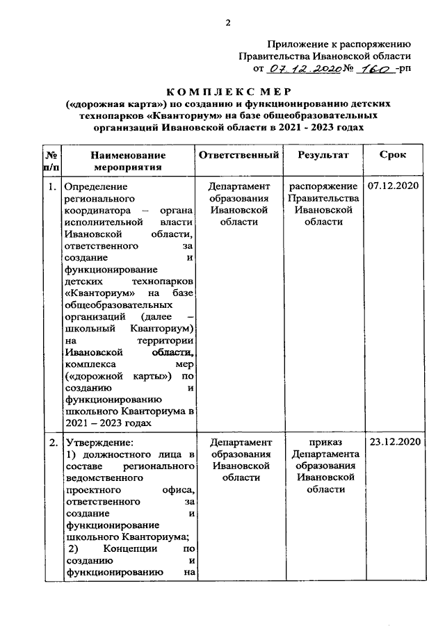 Распоряжение Правительства Ивановской области от 07.12.2020 N 160-рп "О создании и функционировании детских технопарков "Кванториум" на базе общеобразовательных организаций Ивановской области в 2021 - 2023 годах"