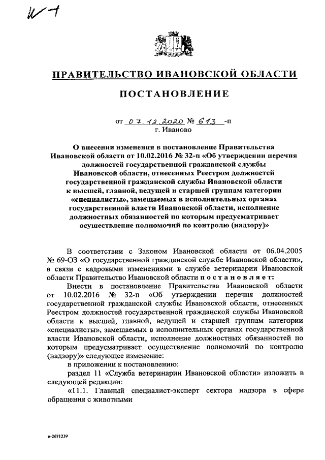 Постановление Правительства Ивановской области от 07.12.2020 N 613-п "О внесении изменения в постановление Правительства Ивановской области от 10.02.2016 N 32-п "Об утверждении перечня должностей государственной гражданской службы Ивановской области, отнесенных Реестром должностей государственной гражданской службы Ивановской области к высшей, главной, ведущей и старшей группам категории "специалисты", замещаемых в исполнительных органах государственной власти Ивановской области, исполнение должностных обязанностей по которым предусматривает осуществление полномочий по контролю (надзору)"