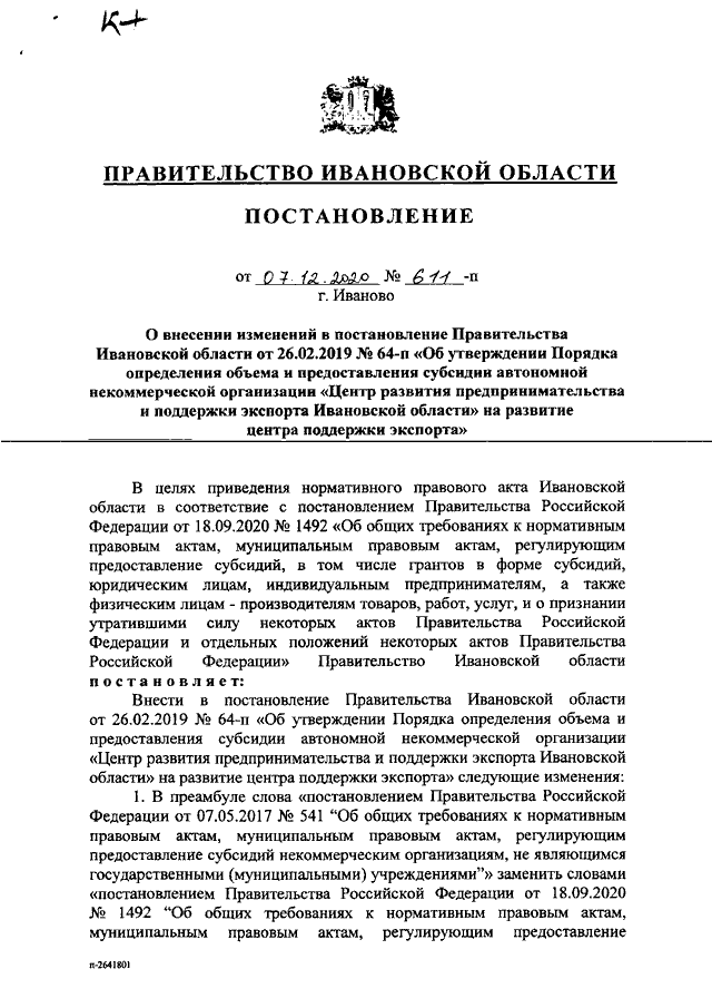 Постановление Правительства Ивановской области от 07.12.2020 N 611-п "О внесении изменений в постановление Правительства Ивановской области от 26.02.2019 N 64-п "Об утверждении Порядка определения объема и предоставления субсидии автономной некоммерческой организации "Центр развития предпринимательства и поддержки экспорта Ивановской области" на развитие центра поддержки экспорта"