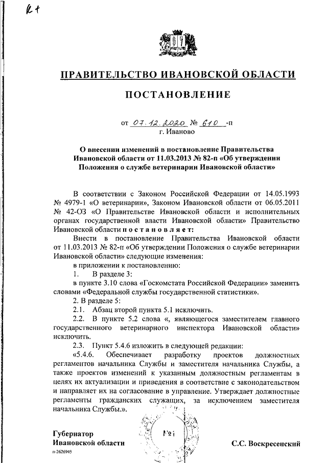 Постановление Правительства Ивановской области от 07.12.2020 N 610-п "О внесении изменений в постановление Правительства Ивановской области от 11.03.2013 N 82-п "Об утверждении Положения о службе ветеринарии Ивановской области"