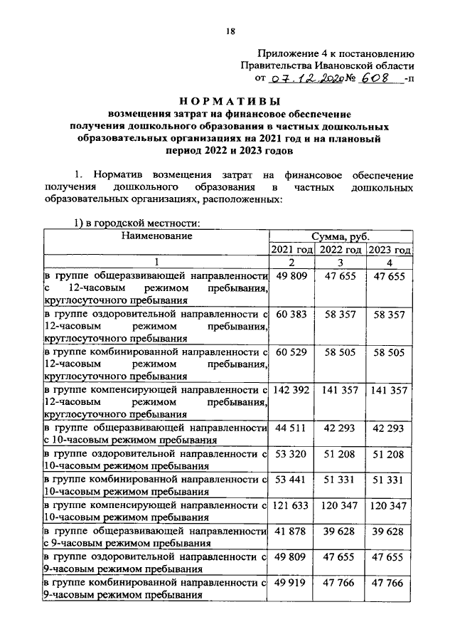 Постановление Правительства Ивановской области от 07.12.2020 N 608-п "Об утверждении нормативов обеспечения государственных гарантий реализации прав на получение общедоступного и бесплатного общего образования, обеспечения дополнительного образования в муниципальных образовательных организациях и возмещения затрат на финансовое обеспечение получения общего образования в частных образовательных организациях на 2021 год и на плановый период 2022 и 2023 годов" (вместе с "Нормативами обеспечения государственных гарантий реализации прав на получение общедоступного и бесплатного дошкольного, начального общего, основного общего, среднего общего образования в муниципальных общеобразовательных организациях, обеспечения дополнительного образования в муниципальных общеобразовательных организациях на 2021 год", "Нормативами возмещения затрат на финансовое обеспечение получения дошкольного, начального общего, основного общего, среднего общего образования в частных общеобразовательных организациях, осуществляющих образовательную деятельность по имеющим государственную аккредитацию основным общеобразовательным программам, на 2021 год", "Перечнем малокомплектных муниципальных общеобразовательных организаций, для которых применяется норматив финансового обеспечения, учитывающий затраты, не зависящие от количества обучающихся, для расчета субвенций местным бюджетам в размере, необходимом для реализации основных общеобразовательных программ в части финансирования расходов на оплату труда работников общеобразовательных организаций, расходов на учебники, учебные пособия, средства обучения, игры, игрушки (за исключением расходов на содержание зданий и оплату коммунальных услуг, осуществляемых из местных бюджетов)")