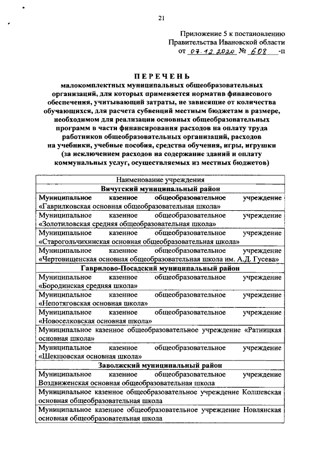 Постановление Правительства Ивановской области от 07.12.2020 N 608-п "Об утверждении нормативов обеспечения государственных гарантий реализации прав на получение общедоступного и бесплатного общего образования, обеспечения дополнительного образования в муниципальных образовательных организациях и возмещения затрат на финансовое обеспечение получения общего образования в частных образовательных организациях на 2021 год и на плановый период 2022 и 2023 годов" (вместе с "Нормативами обеспечения государственных гарантий реализации прав на получение общедоступного и бесплатного дошкольного, начального общего, основного общего, среднего общего образования в муниципальных общеобразовательных организациях, обеспечения дополнительного образования в муниципальных общеобразовательных организациях на 2021 год", "Нормативами возмещения затрат на финансовое обеспечение получения дошкольного, начального общего, основного общего, среднего общего образования в частных общеобразовательных организациях, осуществляющих образовательную деятельность по имеющим государственную аккредитацию основным общеобразовательным программам, на 2021 год", "Перечнем малокомплектных муниципальных общеобразовательных организаций, для которых применяется норматив финансового обеспечения, учитывающий затраты, не зависящие от количества обучающихся, для расчета субвенций местным бюджетам в размере, необходимом для реализации основных общеобразовательных программ в части финансирования расходов на оплату труда работников общеобразовательных организаций, расходов на учебники, учебные пособия, средства обучения, игры, игрушки (за исключением расходов на содержание зданий и оплату коммунальных услуг, осуществляемых из местных бюджетов)")