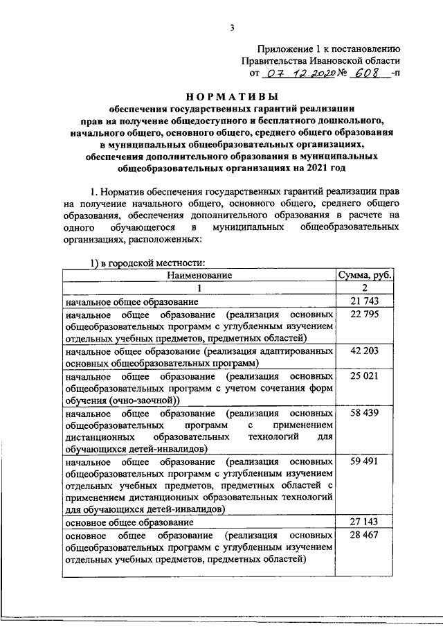 Постановление Правительства Ивановской области от 07.12.2020 N 608-п "Об утверждении нормативов обеспечения государственных гарантий реализации прав на получение общедоступного и бесплатного общего образования, обеспечения дополнительного образования в муниципальных образовательных организациях и возмещения затрат на финансовое обеспечение получения общего образования в частных образовательных организациях на 2021 год и на плановый период 2022 и 2023 годов" (вместе с "Нормативами обеспечения государственных гарантий реализации прав на получение общедоступного и бесплатного дошкольного, начального общего, основного общего, среднего общего образования в муниципальных общеобразовательных организациях, обеспечения дополнительного образования в муниципальных общеобразовательных организациях на 2021 год", "Нормативами возмещения затрат на финансовое обеспечение получения дошкольного, начального общего, основного общего, среднего общего образования в частных общеобразовательных организациях, осуществляющих образовательную деятельность по имеющим государственную аккредитацию основным общеобразовательным программам, на 2021 год", "Перечнем малокомплектных муниципальных общеобразовательных организаций, для которых применяется норматив финансового обеспечения, учитывающий затраты, не зависящие от количества обучающихся, для расчета субвенций местным бюджетам в размере, необходимом для реализации основных общеобразовательных программ в части финансирования расходов на оплату труда работников общеобразовательных организаций, расходов на учебники, учебные пособия, средства обучения, игры, игрушки (за исключением расходов на содержание зданий и оплату коммунальных услуг, осуществляемых из местных бюджетов)")
