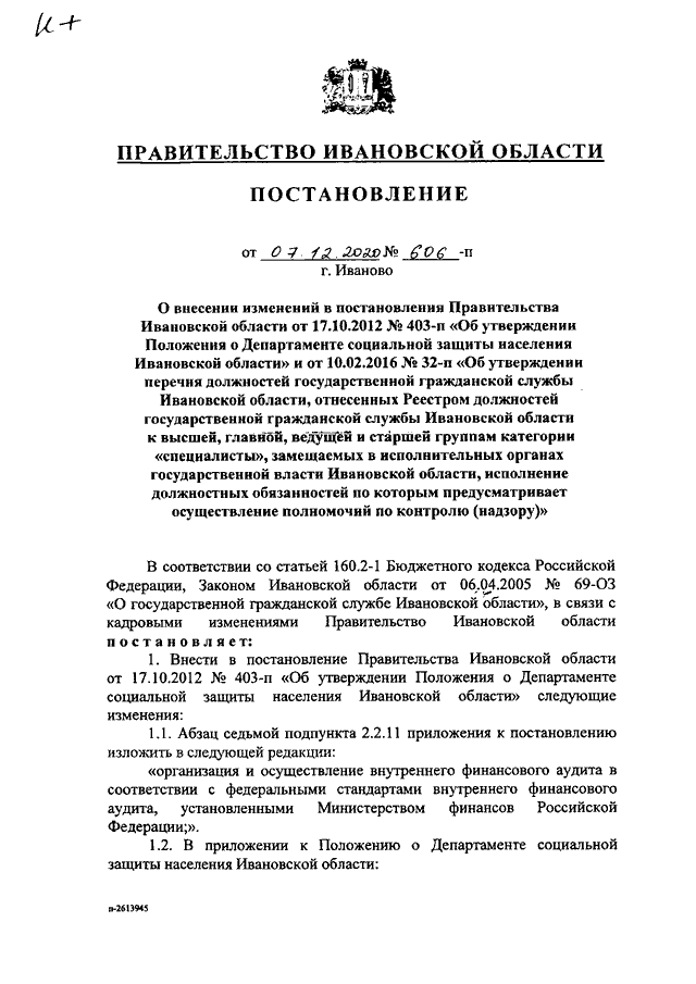 Постановление Правительства Ивановской области от 07.12.2020 N 606-п "О внесении изменений в постановления Правительства Ивановской области от 17.10.2012 N 403-п "Об утверждении Положения о Департаменте социальной защиты населения Ивановской области" и от 10.02.2016 N 32-п "Об утверждении перечня должностей государственной гражданской службы Ивановской области, отнесенных Реестром должностей государственной гражданской службы Ивановской области к высшей, главной, ведущей и старшей группам категории "специалисты", замещаемых в исполнительных органах государственной власти Ивановской области, исполнение должностных обязанностей по которым предусматривает осуществление полномочий по контролю (надзору)"