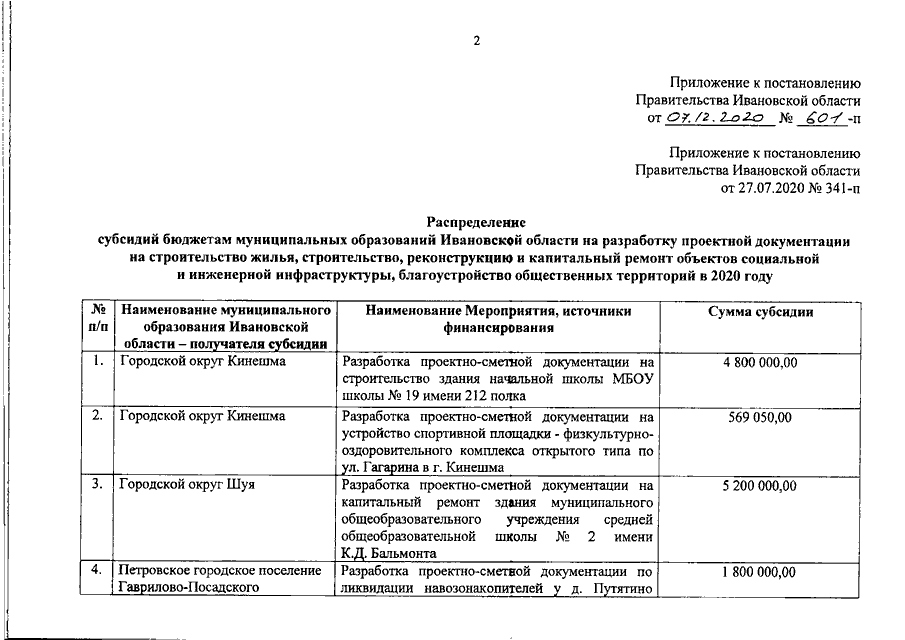 Постановление Правительства Ивановской области от 07.12.2020 N 601-п "О внесении изменений в постановление Правительства Ивановской области от 27.07.2020 N 341-п "О распределении субсидий бюджетам муниципальных образований Ивановской области на разработку проектной документации на строительство жилья, строительство, реконструкцию и капитальный ремонт объектов социальной и инженерной инфраструктуры, благоустройство общественных территорий в 2020 году"