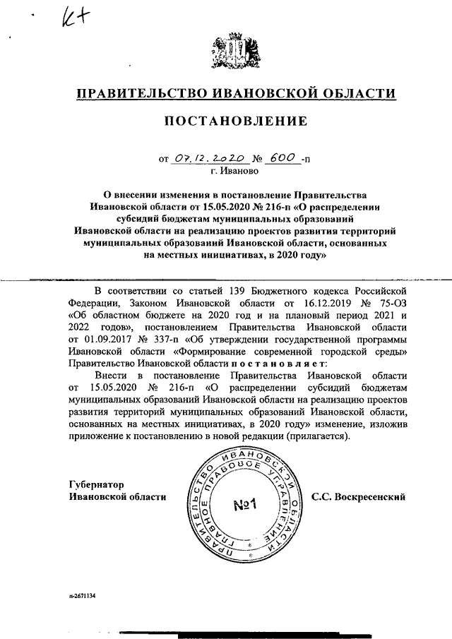 Постановление Правительства Ивановской области от 07.12.2020 N 600-п "О внесении изменения в постановление Правительства Ивановской области от 15.05.2020 N 216-п "О распределении субсидий бюджетам муниципальных образований Ивановской области на реализацию проектов развития территорий муниципальных образований Ивановской области, основанных на местных инициативах, в 2020 году"