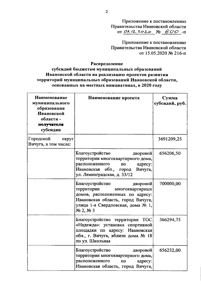 Постановление Правительства Ивановской области от 07.12.2020 N 600-п "О внесении изменения в постановление Правительства Ивановской области от 15.05.2020 N 216-п "О распределении субсидий бюджетам муниципальных образований Ивановской области на реализацию проектов развития территорий муниципальных образований Ивановской области, основанных на местных инициативах, в 2020 году"