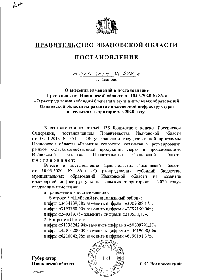 Постановление Правительства Ивановской области от 07.12.2020 N 599-п "О внесении изменений в постановление Правительства Ивановской области от 10.03.2020 N 86-п "О распределении субсидий бюджетам муниципальных образований Ивановской области на развитие инженерной инфраструктуры на сельских территориях в 2020 году"