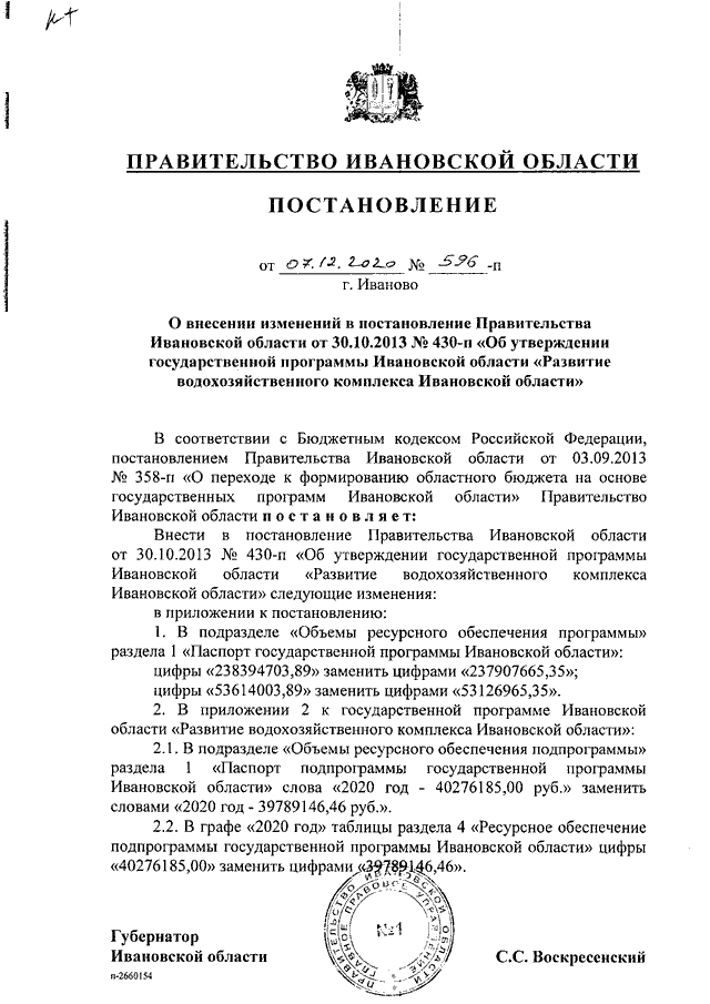 Постановление Правительства Ивановской области от 07.12.2020 N 596-п "О внесении изменений в постановление Правительства Ивановской области от 30.10.2013 N 430-п "Об утверждении государственной программы Ивановской области "Развитие водохозяйственного комплекса Ивановской области"