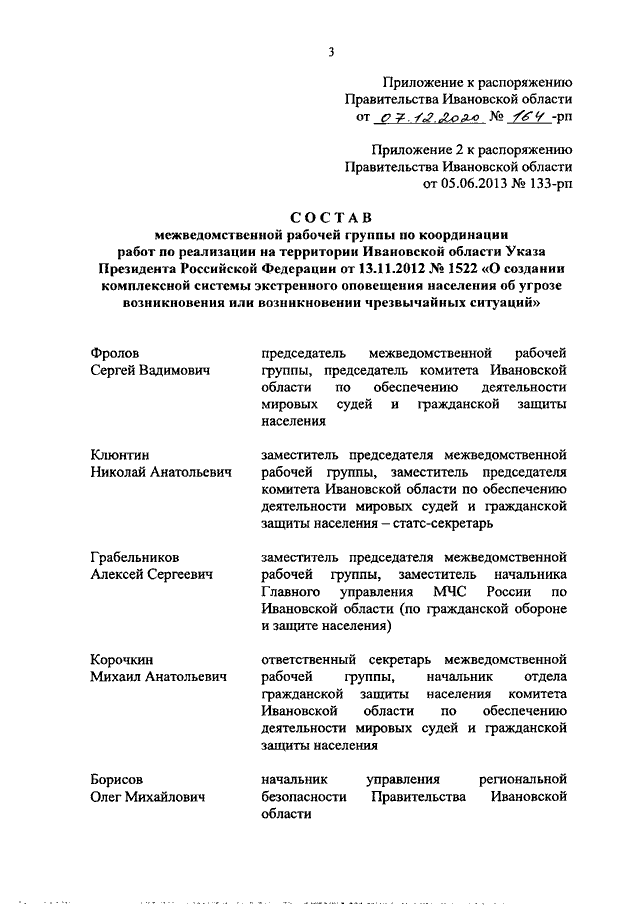 Распоряжение Правительства Ивановской области от 07.12.2020 N 164-рп "О внесении изменений в распоряжение Правительства Ивановской области от 05.06.2013 N 133-рп "О реализации на территории Ивановской области Указа Президента Российской Федерации от 13.11.2012 N 1522 "О создании комплексной системы экстренного оповещения населения об угрозе возникновения или о возникновении чрезвычайных ситуаций"