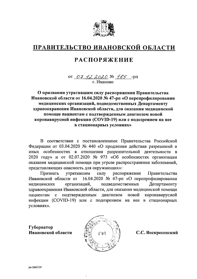 Распоряжение Правительства Ивановской области от 07.12.2020 N 165-рп "О признании утратившим силу распоряжения Правительства Ивановской области от 16.04.2020 N 47-рп "О перепрофилировании медицинских организаций, подведомственных Департаменту здравоохранения Ивановской области, для оказания медицинской помощи пациентам с подтвержденным диагнозом новой коронавирусной инфекции (COVID-19) или с подозрением на нее в стационарных условиях"