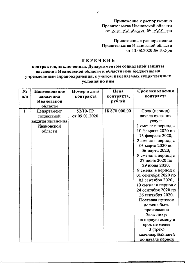 Распоряжение Правительства Ивановской области от 07.12.2020 N 168-рп "О внесении изменений в распоряжение Правительства Ивановской области от 13.08.2020 N 102-рп "Об изменении условий контрактов" (вместе с "Перечнем контрактов, заключенных Департаментом социальной защиты населения Ивановской области и областными бюджетными учреждениями здравоохранения, с учетом изменяемых существенных условий по ним")