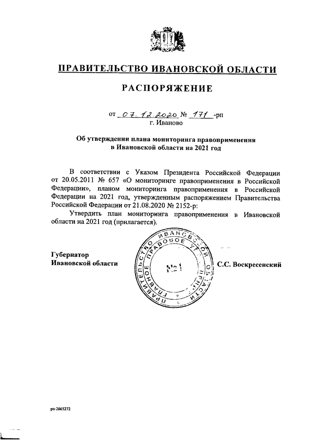 Распоряжение Правительства Ивановской области от 07.12.2020 N 171-рп "Об утверждении плана мониторинга правоприменения в Ивановской области на 2021 год"