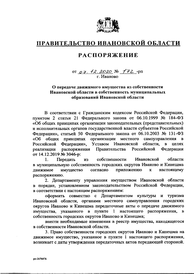 Распоряжение Правительства Ивановской области от 07.12.2020 N 172-рп "О передаче движимого имущества из собственности Ивановской области в собственность муниципальных образований Ивановской области"